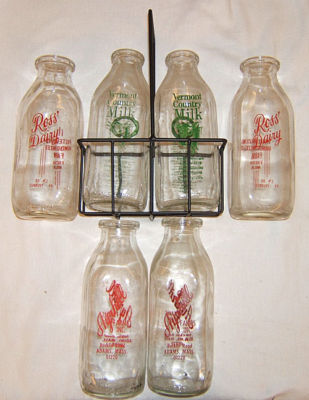6 Old dairy milk bottles wire carrier Ross Dairy Ayrhill Vermont Country qt NR l