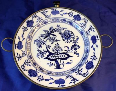 Title (ebay affiliate link): Antique German Blue Onion Painted Porcelain & Metal Warming Plate Aluminum NR