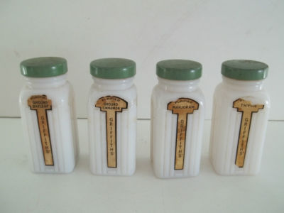 Title (ebay affiliate link): 4 Vintage GRIFFITH'S Milk Glass SPICE JAR Set with Green Lids & Paper Labels