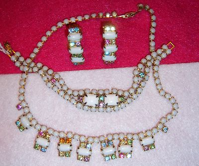 VTG. JULIANA WHITE MILKGLASS AND FRUIT SALAD RHINESTONE NECKLACE BRACELET & EARR