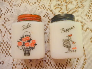 Title (ebay affiliate link): Old Vintage Milkglass Salt/Pepper Shakers, girl/flowers TIPP USA