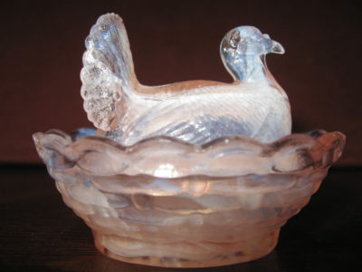 Title (ebay affiliate link): PINK MILK SLAG ART GLASS HEN TURKEY ON NEST BASKET DISH CHICKEN SALT CELLAR CELT