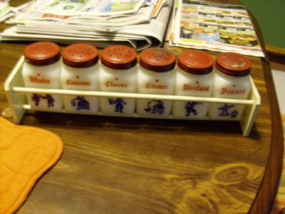 Title (ebay affiliate link): Vintage Milk Glass Bottles Jar Spice Rack Dutch Pattern Hazel Atlas Dove