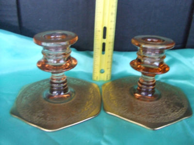 Title (ebay affiliate link): Vintage pink depression glass with gold trim candle holders patterned glass base