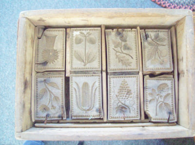 Antique wood butter molds set of 8 in frame w/fuits, sheaf of wheat, corn, etc