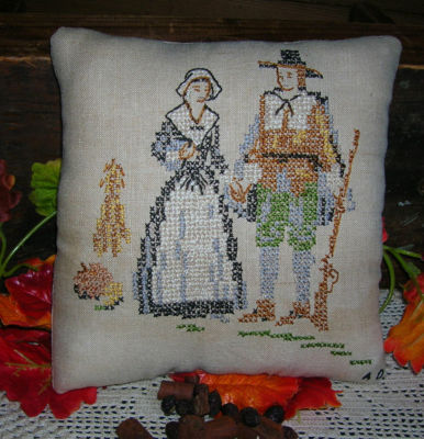 Title (ebay affiliate link): Primitive VINTAGE Repurposed Cross Stitch THANKSGIVING PILGRIMS Sampler Pillow