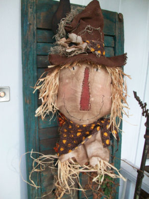 Title (ebay affiliate link): Primitive Halloween or Fall Handmade Scarecrow Door or Wall Hanger