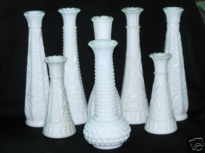 8-BUD VASES HOBNAIL, CUT FLORAL, RIB, ETC. MILK GLASS!!