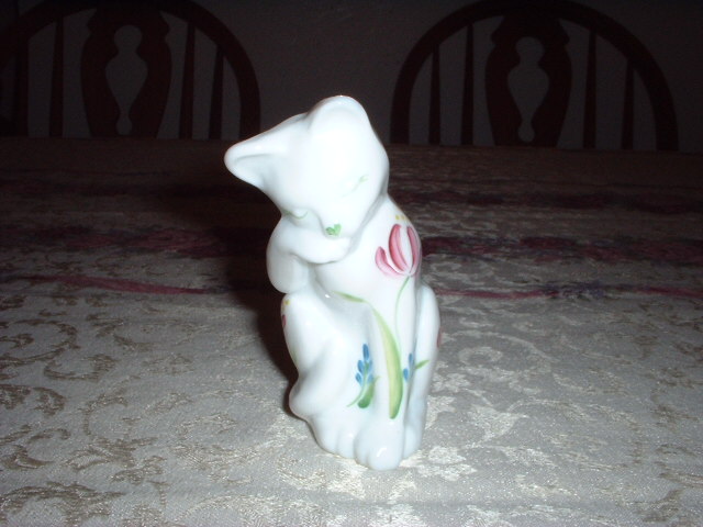 Fenton Milk Glass Cat Figurine Flowers Signed & Sticker
