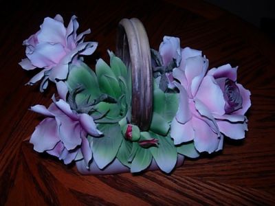 Title (ebay affiliate link): VTG CAPODIMONTE OPEN ROSES FLORAL BASKET AITA ITALY W/ LABEL GORGEOUS COLORS