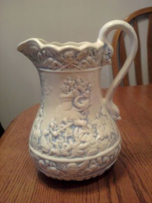Title (ebay affiliate link): Antique ? Blue White Water Pitcher Scalloped Embossed War Images Poseidon Troy