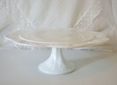 Title (ebay affiliate link): Large White Milk Glass Cake Pedestal Plate Stand Indiana Harvest Grapes Pattern