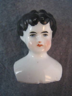 Antique German China Doll Head, 1 3/4 In., Black Hair!