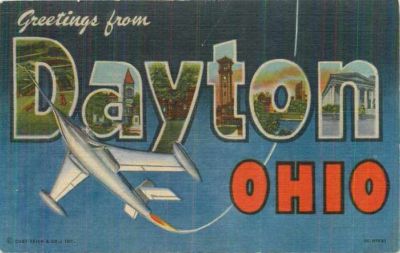 Dayton Ohio~Large Letter Linen Postcard~Silver Steam Jet Plane~Smoke Trail~1950