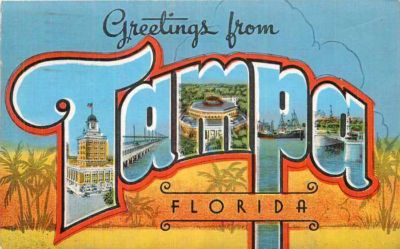 Title (ebay affiliate link): Tampa Florida~Large Letter Linen Postcard~Palm Trees~Sunset~Ships~Pier~Downtown