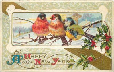 Title (ebay affiliate link): New Year~Fat Little Birds on Branch~Orange Red Blue Yellow~Embossed~Gold Stripe