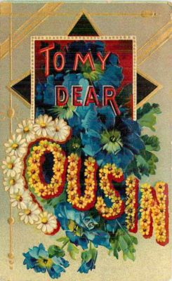 Title (ebay affiliate link): To My Dear Cousin~Red Blue~Bright Bold Gold Art Nouveau~Daisy Letters~Germany