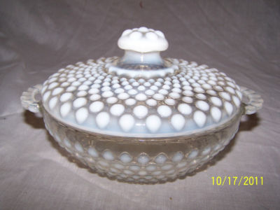 Title (ebay affiliate link): "ANTIQUE" 1890 VICTORIAN FENTON HOBNAIL OPALESCENT CANDY DISH w/LID & HANDLES
