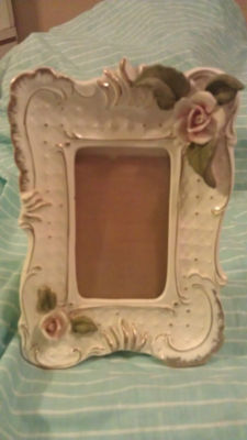 Title (ebay affiliate link): Antique Vintage Porcelain Frame with Gilded Accents and Pink Roses
