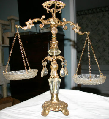 Title (ebay affiliate link): Antique Scale W/ Vintage German Lead Hanging Crystal Chandelier Prisms & Dishes