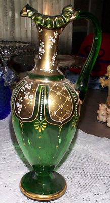 Ewer Pitcher Green Handpainted Hand Blown Gold & Forget Me Nots