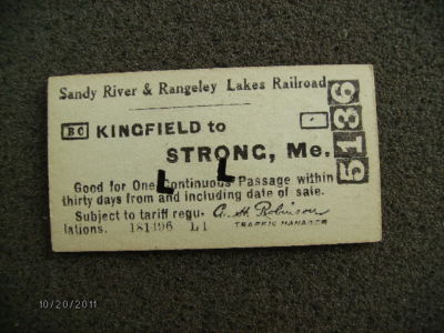 SANDY RIVER & RANGELEY LAKES RAILROAD 1934 TICKET KINGFIELD TO STRONG MAINE