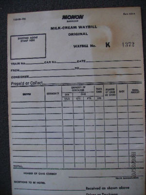 MONON RAILROAD UNUSED MILK-CREAM TRANSPORATION WAY BILL