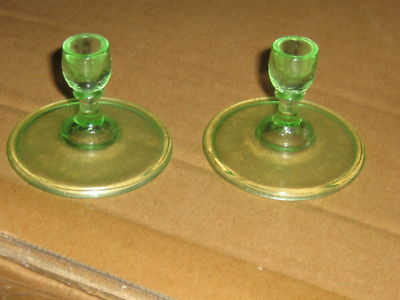 Title (ebay affiliate link): MINIATURE MINI GREEN DEPRESSION GLASS CANDLE STICK HOLDERS ETCHED