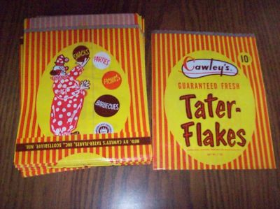 Title (ebay affiliate link): LOT OF 33 WAXED BAGS CAWLEY'S TATER FLAKES OTHER SIDE CLOWN SNACKS ADVERTISING