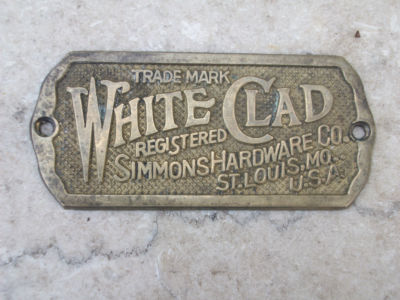 Antique Brass Wood Ice Box Furniture Tag Label Simmons Hardware Co. White Clad