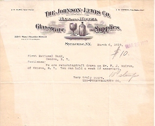 Title (ebay affiliate link): 1912 The Johnson-Lewis Co.Bar&Hotel Glassware-graphic letterhead-Syracuse NY