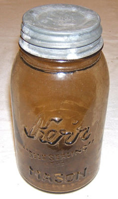 Old glass Amber fruit jar w zinc lid Kerr Mason qt NR lot