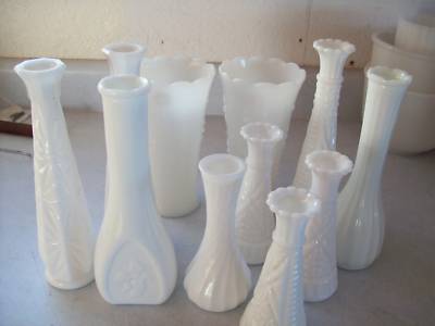 White Milk Glass-Lot of 11-Floral and Bud Vases