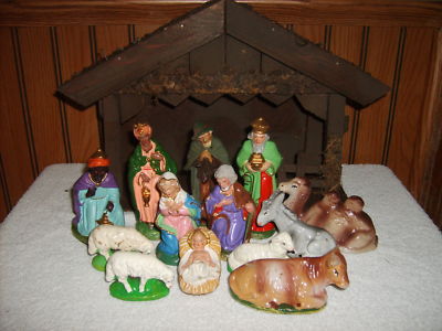 Title (ebay affiliate link): 13 Piece Paper Mache Nativity Set and Wooden Stable West Germany