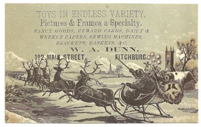 c1880 W. A. Dunn TOYS PICTURES FANCY GOODS FITCHBURG Trade Card Santa's Sleigh