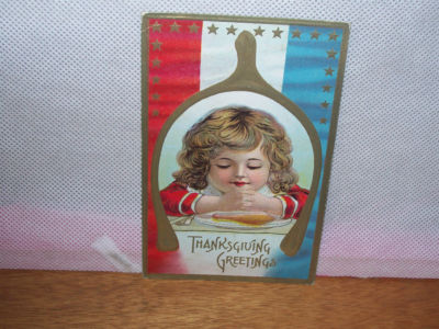 Title (ebay affiliate link): PATRIOTIC THANKSGIVING P/C "CHILD PRAYING OVER HIS TURKEY DRUMSTICK" LOOK!!!!!!!
