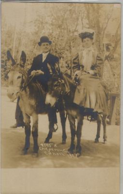Title (ebay affiliate link): Cheyenne Canon CO, 1907 real photo postcard, Dressed up Couple on Donkeys