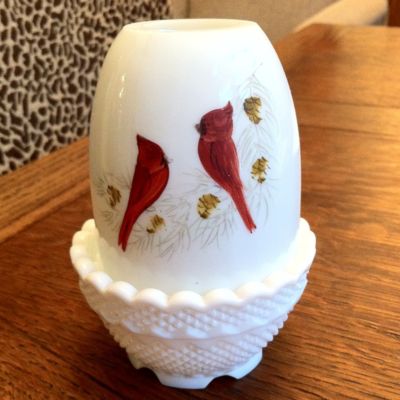 Title (ebay affiliate link): Fenton Fairy Lamp Light Christmas Vintage 1970s Red Cardinal Bird Milk Glass