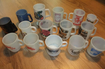 Title (ebay affiliate link): 23 Vintage Milk Glass Mug Collection Anchor Hocking Fire King Advertising