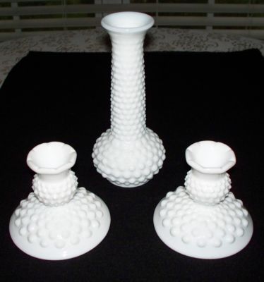 3 Pieces of Hobnail Milk Glass 2 Candle Holders & Vase