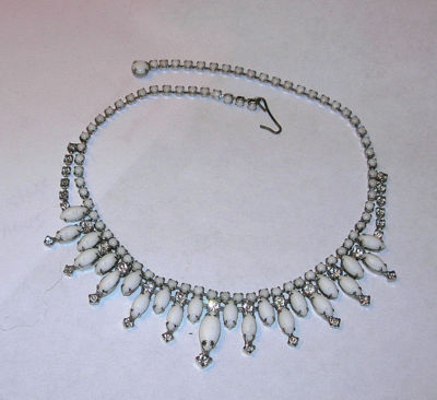 Title (ebay affiliate link): VINTAGE WHITE MILK GLASS & RHINESTONE NECKLACE w/ prong set CABOCHON SETS
