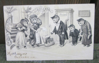 Title (ebay affiliate link): PAIR OF CATS CHECKING INTO HOTEL WITH CAT PORTIERS 1907