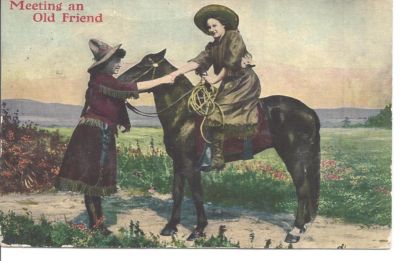 Title (ebay affiliate link): Early View Postcard-Two Cowgirls with Six Shooter-"Meeting an Old Friend"