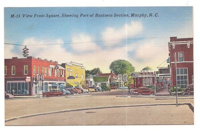 Title (ebay affiliate link): 2 Linen Unused Postcards-Ca. 1940-Busy Downtown, Murphy,NC-Cars/Stores/Street-VF