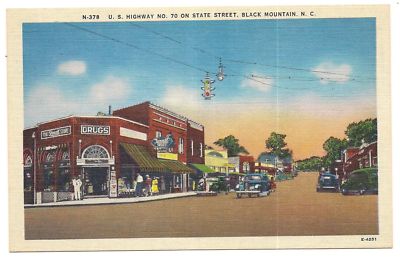 Title (ebay affiliate link): 1940's Linen Unused Postcard-Busy Downtown, Black Mountain, NC-Cars/Stores/Signs