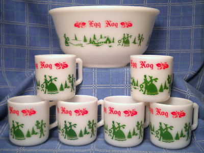 Title (ebay affiliate link): Vintage Hazel Atlas Milk Glass Christmas Egg Nog Bowl Set 6 Cups Mugs