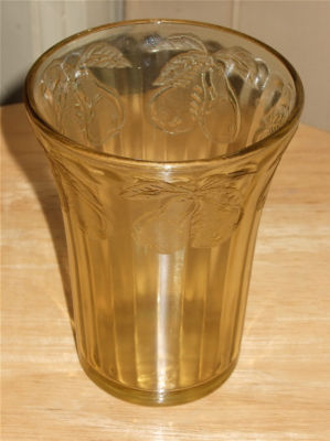 Title (ebay affiliate link): Fruits Pattern Amber 4.25 inch Depression Glass Tumbler -unknown maker
