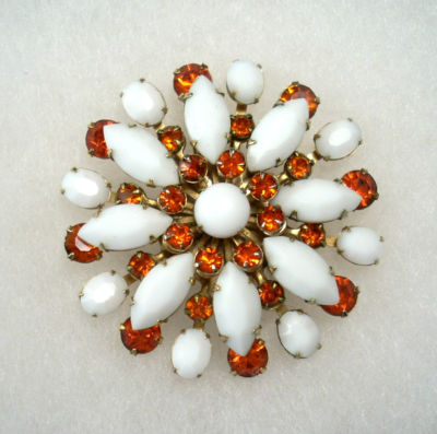 Title (ebay affiliate link): Vtg Signed WEISS White Milk GLASS-ORANGE RHINESTONE BROOCH