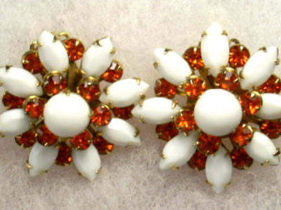 Title (ebay affiliate link): Vtg Signed WEISS White Milk GLASS-ORANGE RHINESTONE Clip EARRINGS