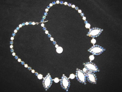 Title (ebay affiliate link): VINTAGE PRONG-SET BLUE AB RHINESTONE & MARQUISE MILK GLASS NECKLACE. ESTATE PC